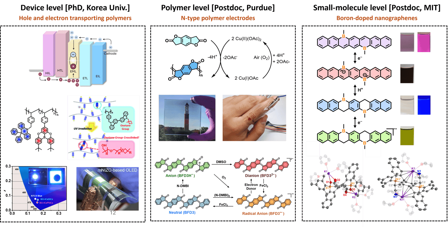 Modern flexible electronics face major challenges due to the brittleness and rigidity of existing conductors. Overcoming these barriers is essential for making devices that can seamlessly interface with soft and dynamic environments. The long-term goal of my research program is to combine organic synthesis, polymer engineering, and soft material processing to build free-form optoelectronic systems that function reliably under deformation and complex geometries.